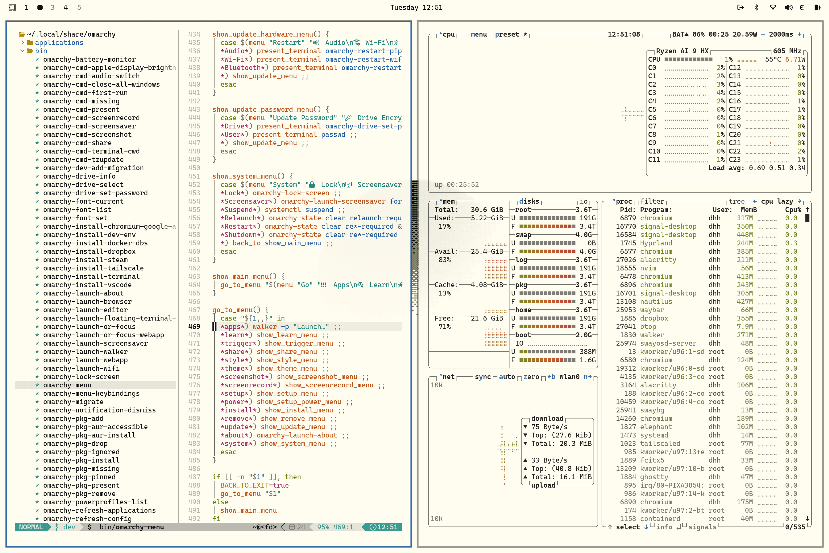 Omarchy comes with fourteen beautiful themes. You can select between them from Style > Theme in the Omarchy Menu (Super + Alt + Space) or hop directly to the selector using Super + Ctrl + Shift + Space.